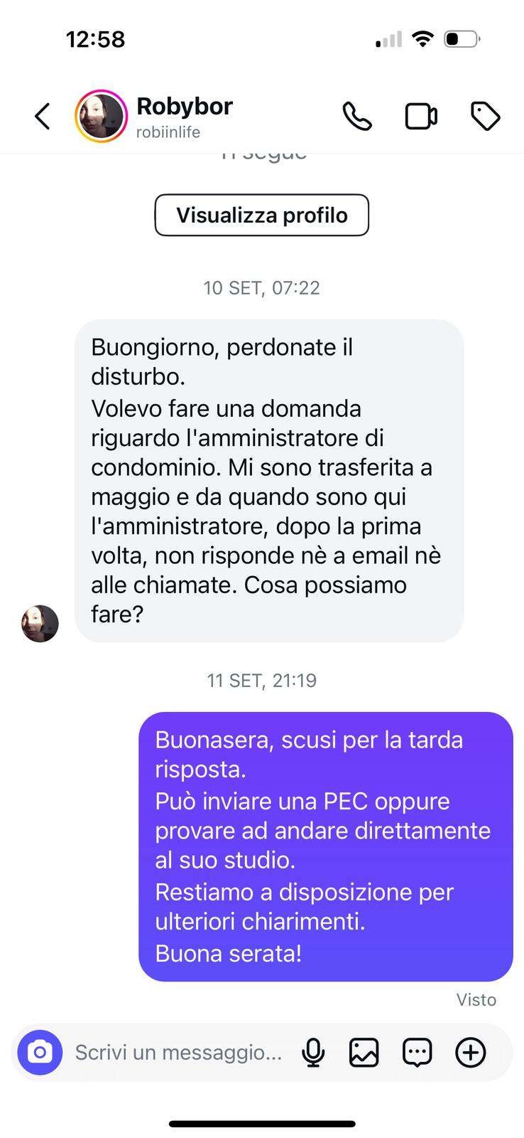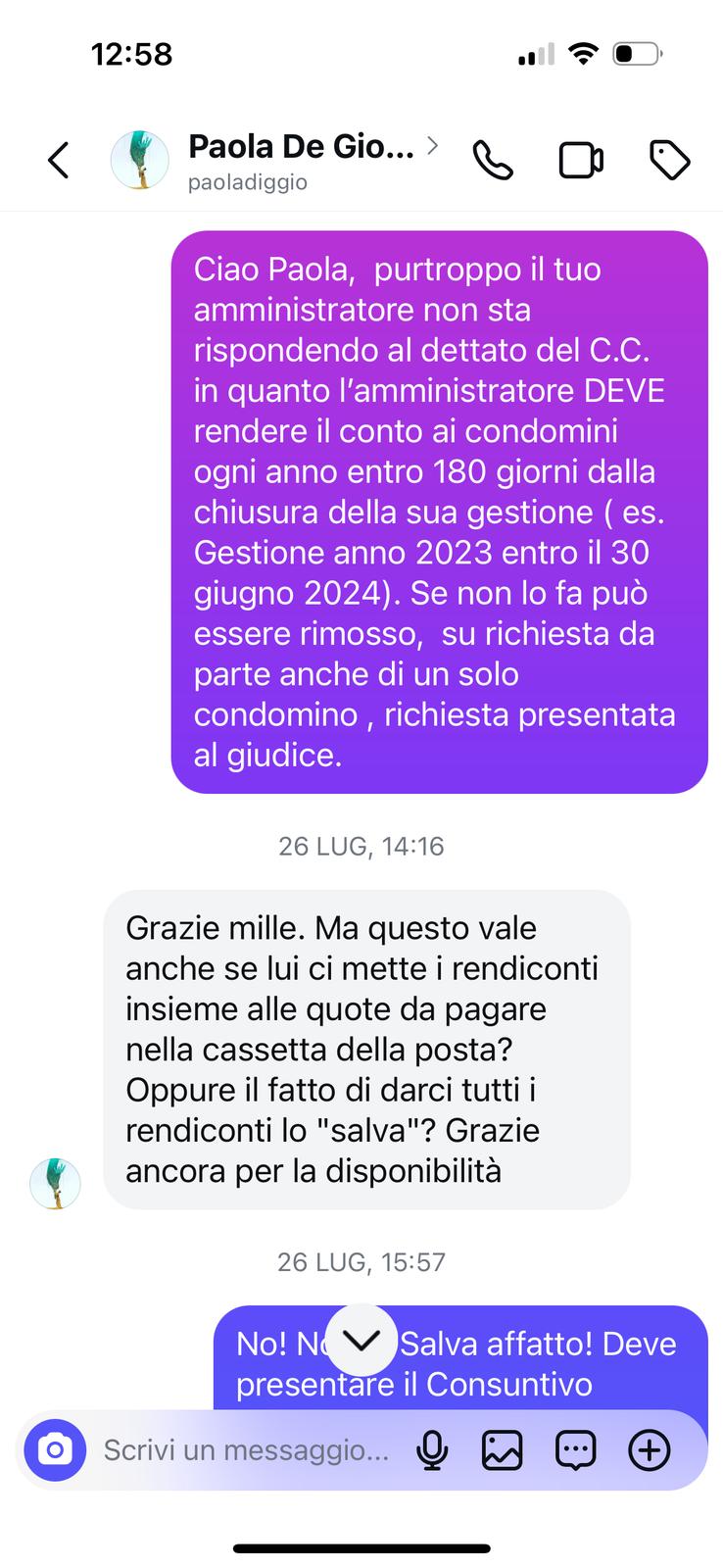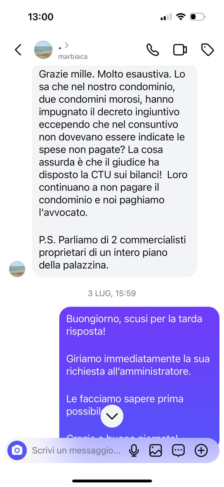 La mia priorità è aiutarti a risolvere i problemi condominiali in modo rapido e concreto. Per questo ho creato un Gruppo WhatsApp riservato, monitorato ogni giorno, dove puoi chiedere supporto e ricevere indicazioni operative. Quando serve, restano disponibili anche e-mail e PEC per le comunicazioni ufficiali. Lavoriamo con criteri chiari e un numero limitato di condomìni, per garantire attenzione, trasparenza e puntualità.